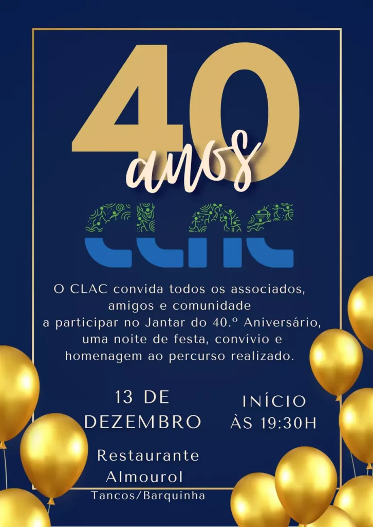 O CLAC convida todos os associados, amigos e comunidade a participar no Jantar do 40.º Aniversário, uma noite de festa, convívio e homenagem ao percurso realizado.